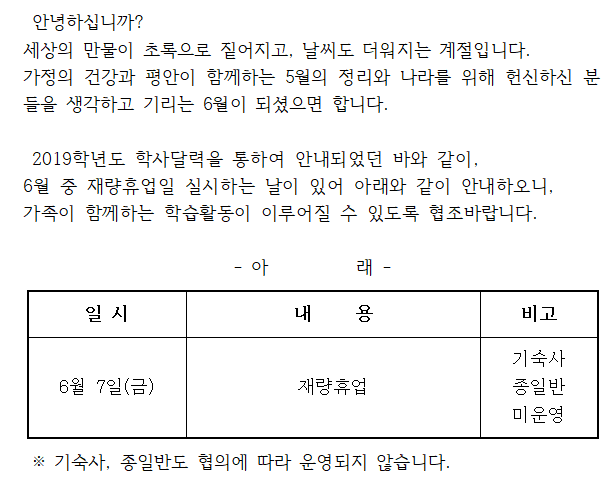 * 2019Çг⵵ ÇлçÀÏÁ¤¿¡ ¾È³»ÇØ µå¸° ¹Ù¿Í °°ÀÌ 6¿ùÁß º»±³ÀÇ Àç·®ÈÞ¾÷ÀÏÀ»