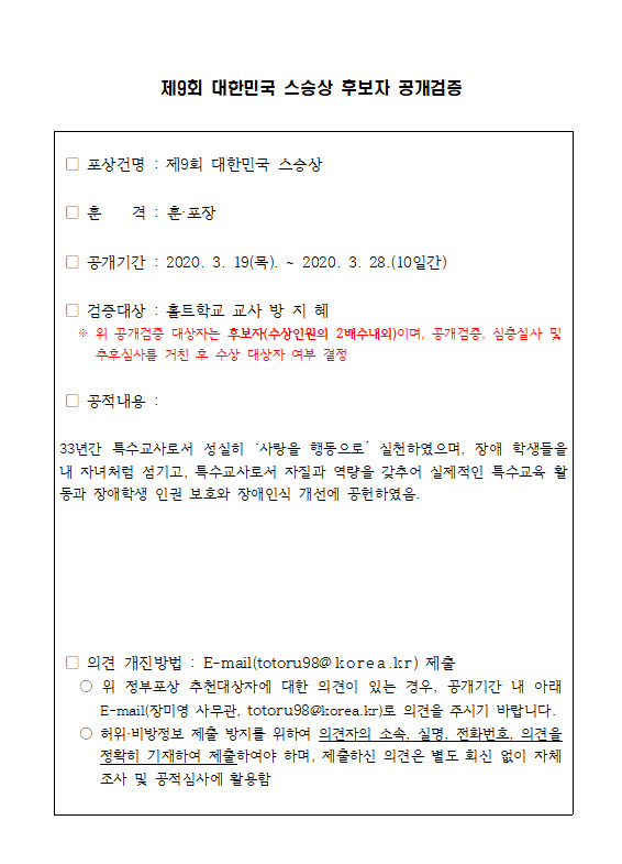 Á¦9ȸ ´ëÇѹα¹ ½º½Â»ó Èĺ¸ÀÚ °ø°³°ËÁõ-ȦƮÇб³ ±³»ç ¹æÁöÇý
