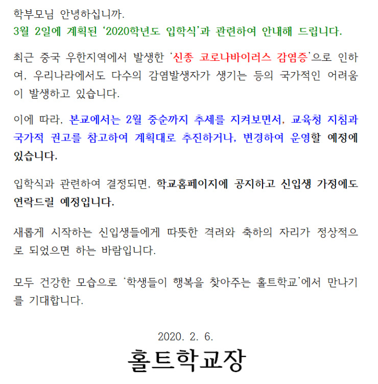 ½ÅÁ¾ Äڷγª¹ÙÀÌ·¯½º¿¡ µû¸¥ ȦƮÇб³ ÀÔÇÐ½Ä °ü·Ã ¾È³»